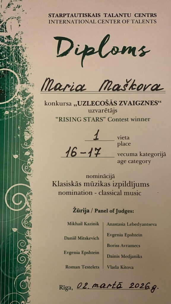 28. veebruarist kuni 2. märtsini toimus Riias rahvusvaheline instrumentalistide ja vokalistide konkurss „Rising Stars 2026“, kus osalesid viiuldajad, pianistid ja lauljad. MUBA on väga uhke oma noorte pianistide üle, kes saavutasid konkursil silmapaistvaid tulemusi:
