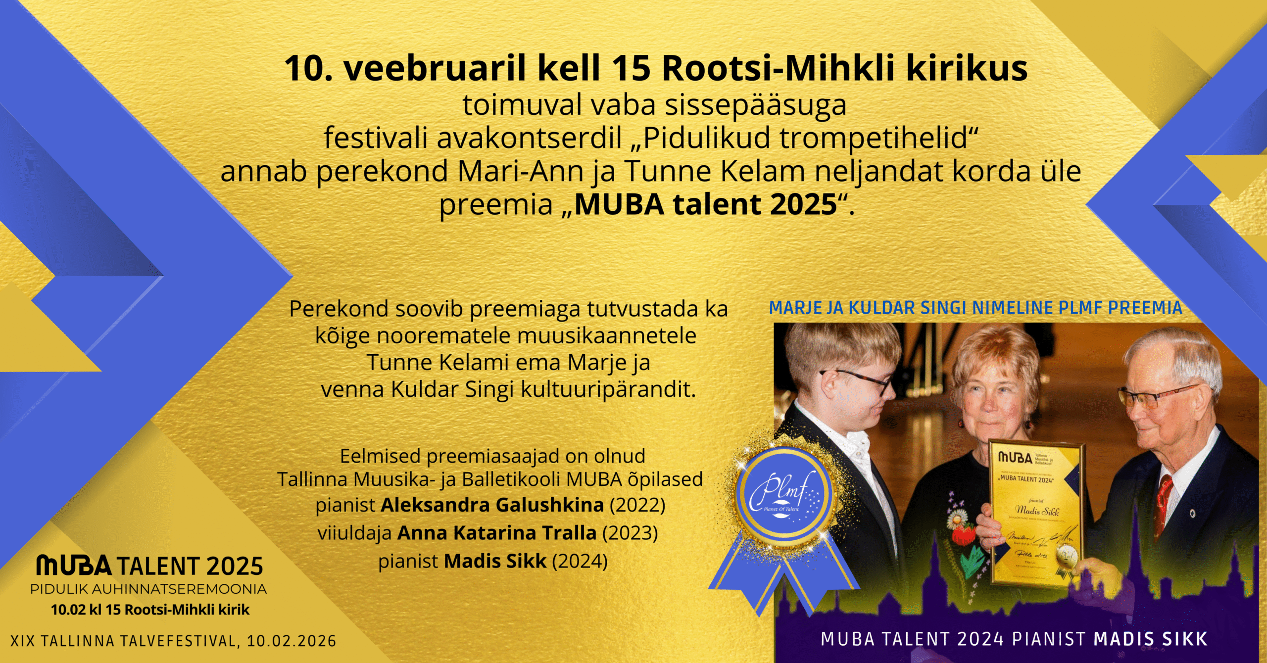 10. veebruaril kell 15 Rootsi-Mihkli kirikus toimuval vaba sissepääsuga festivali avakontserdil „Pidulikud trompetihelid“ annab perekond Mari-Ann ja Tunne Kelam neljandat korda üle preemia „MUBA talent 2025“. Perekond soovib preemiaga tutvustada ka kõige noorematele muusikaannetele Tunne Kelami ema Marje ja venna Kuldar Singi kultuuripärandit. Eelmised preemiasaajad on olnud Tallinna Muusika- ja Balletikooli MUBA õpilased pianist Aleksandra Galushkina (2022), viiuldaja Anna Katarina Tralla (2023) ja pianist Madis Sikk (2024).
